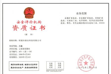 2003年11月10日,昭通市鼎安科技有限公司成立,初始主要從事第三方安全工程技術服務,經(jīng)多年運營,發(fā)展為多專業(yè)綜合科技平臺,為社會提供多種專業(yè)技術服務工作。 現(xiàn)公司注冊資金為1200萬元,公司法定代表人:毛衛(wèi)旭。公司主要業(yè)務:安全評價、安全標準化評審、安全工程技術服務;環(huán)境監(jiān)測、職業(yè)衛(wèi)生檢測、檢驗;法律訴訟及非訴訟服務;司法鑒定、固定資產(chǎn)投資項目節(jié)能服務;工程咨詢;工程測量測繪;安全教育培訓等。是安全生產(chǎn)服務、安全教育培訓機構(gòu),也是環(huán)境監(jiān)測和職業(yè)衛(wèi)生服務機構(gòu),同時也是綜合的檢測檢驗、綜合科技平臺服務機構(gòu)。多年來為公、檢、法、司、軍、警、海關、仲裁、安監(jiān)、工礦商貿(mào)企業(yè)、社會團體及個人提供多專業(yè)技術服務。